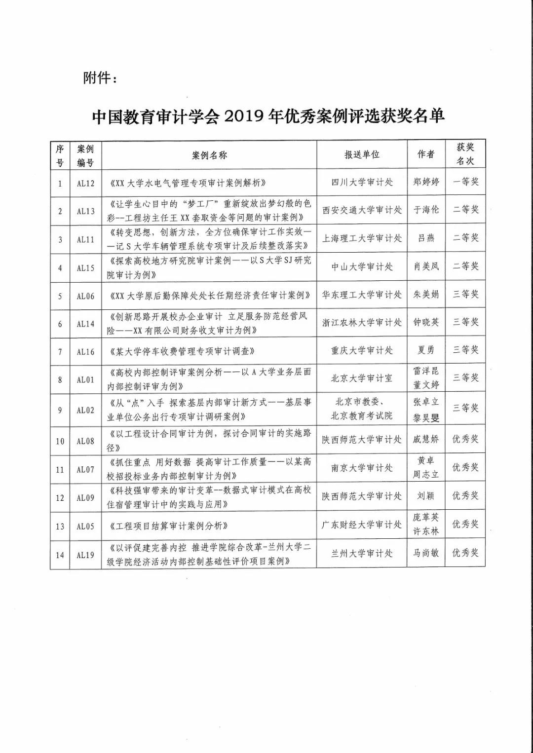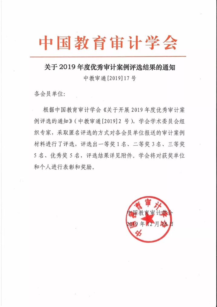 根据中国教育审计学会2019年12月18日发布的《关于2019年度优秀审计案例评选结果的通知》,学会学术委员会组织专家从各大高校报送的审计案例材料中评选出一等奖1名,二等奖3名,三等奖5名,优秀奖5名。yl23411集团官网审计处报送的《XX大学水电气管理专项审计案例解析》获得了一等奖。