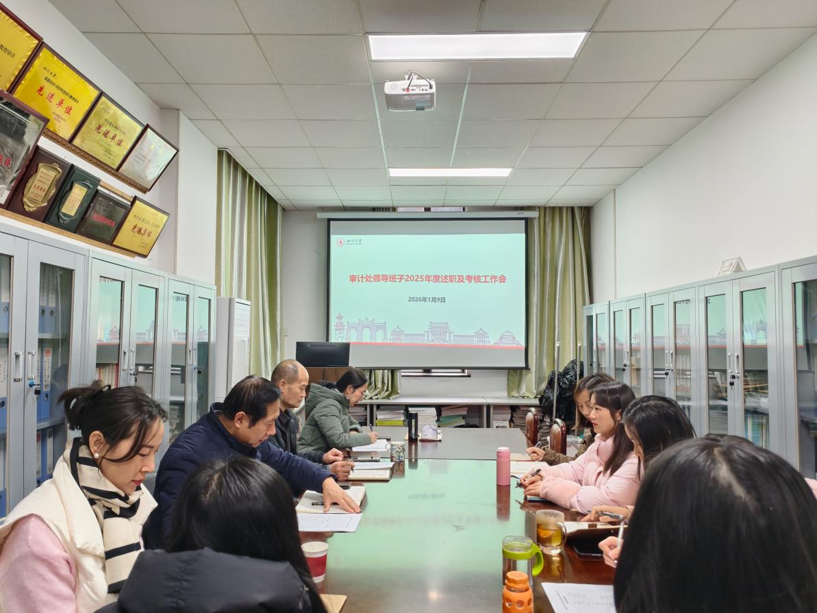 2026年1月9日上午9点,yl23455永利集团召开2025年度领导班子述职及考核工作会,校党委组织部相关工作人员及审计处全体人员参加会议,会议由yl23455永利集团党支部书记、处长李晓峰主持。